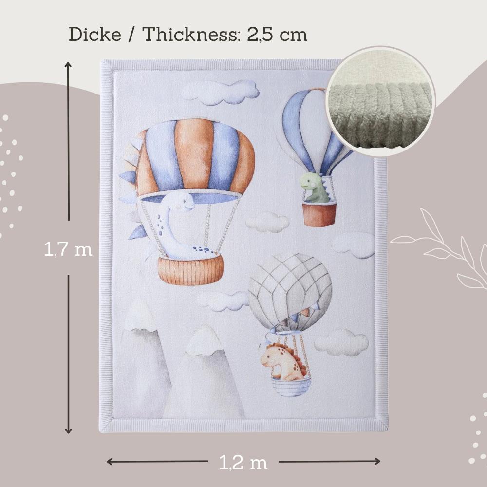 Il tappeto ''Nuvola'' - Mongolfiere e Dinosauri per bambini è composto da tre strati: 1. Velluto di corallo per il contatto della pelle più morbido, 2. schiuma di memoria elastica per un gioco confortevole e strisciante, 3. schiena antiscivolo per la protezione contro gli urti quando si cade. A causa delle dimensioni extra di 170 x 120 x 2,5 cm, questo tappeto per bambini è perfetto per strisciare, giocare e yoga e per il fitness a casa. Elegante e giocoso allo stesso tempo - questo tappetino di alta qualità Premium Memory Foam spesso porta stile e calore in qualsiasi soggiorno o camera dei bambini. I colori morbidi del pastello si armonizzano perfettamente con il tuo interno e creano un'atmosfera piena di sicurezza e benessere. La schiuma di memoria premium è di 2 cm di spessore e prende le sue dimensioni più velocemente (entro 1-2 giorni) rispetto alle alternative più economiche. Il tappeto da gioco per i bambini viene consegnato piegato come una coperta e, a differenza dei tappeti striscianti confezionati sottovuoto per i bambini, non ha bisogno di essere stirato. L'imballaggio compresso consente di risparmiare spazio durante il trasporto e ridurre le emissioni di carbonio. Facile da mantenere e igenico - questo tappetino da gioco per i bambini può essere pulito in pochi secondi con un aspirapolvere o un panno umido e sapone. Il soffice tappeto per bambini è lavabile a mano a 30°C e adatto per il riscaldamento a pavimento. Dimensione: 1,7 x 1,2 m; Spessore: 2,5 cm.