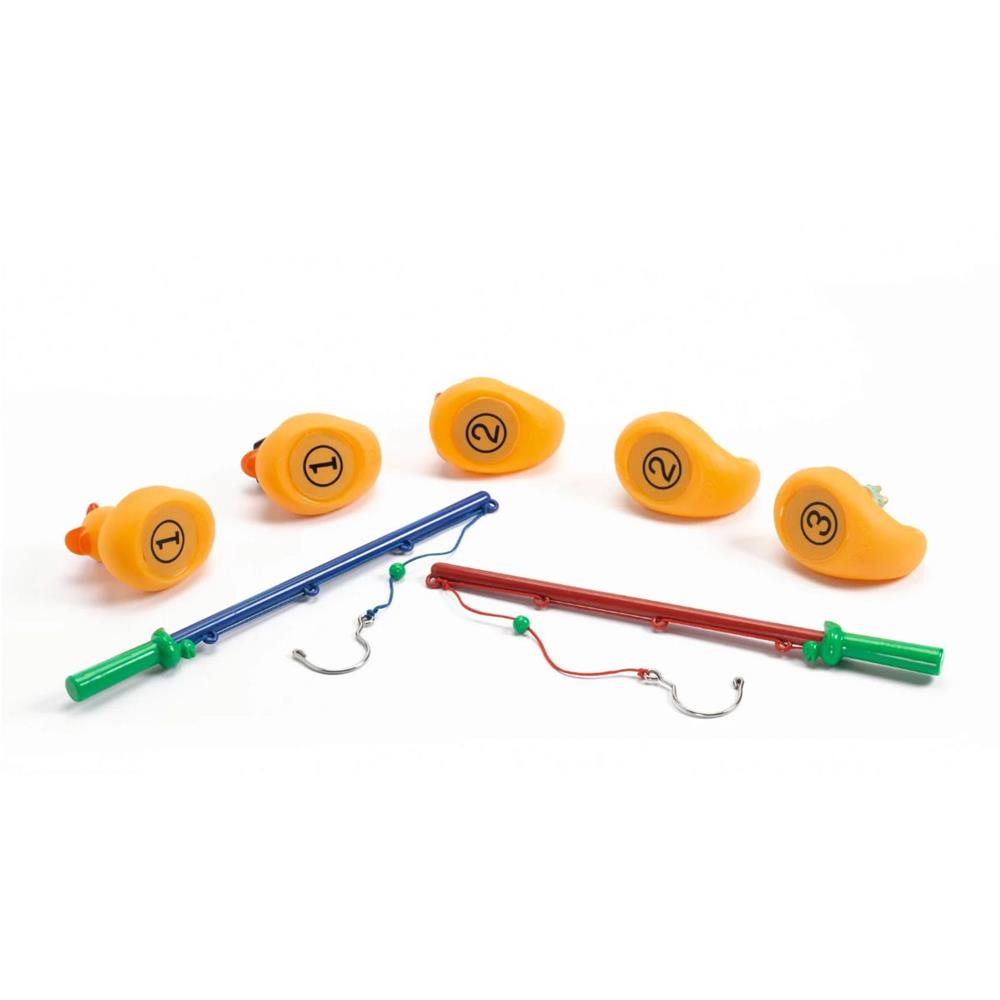 Divertiti con la pesca alle anatre di gomma. Un gioco di pesca alla lenza che include 2 canne da pesca e 5 simpatiche paperelle. Con un po' di abilità e tante risate, i pescatori in erba si divertiranno un sacco! Le papere sono numerate, così con la creatività e fantasia si possono inventare nuove regole di gioco. Papere galleggianti: non si capovolgono una volta messe sull'acqua. Canne da pesca corte, più facili da maneggiare per i bambini da 2 anni in su. Ideale per giocare da soli o in più bambini, in casa o all'aperto. Contenuto della confezione: 5 papere di plastica e 2 canne da pesca per giocare con gli amici.