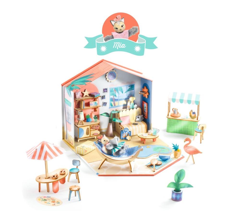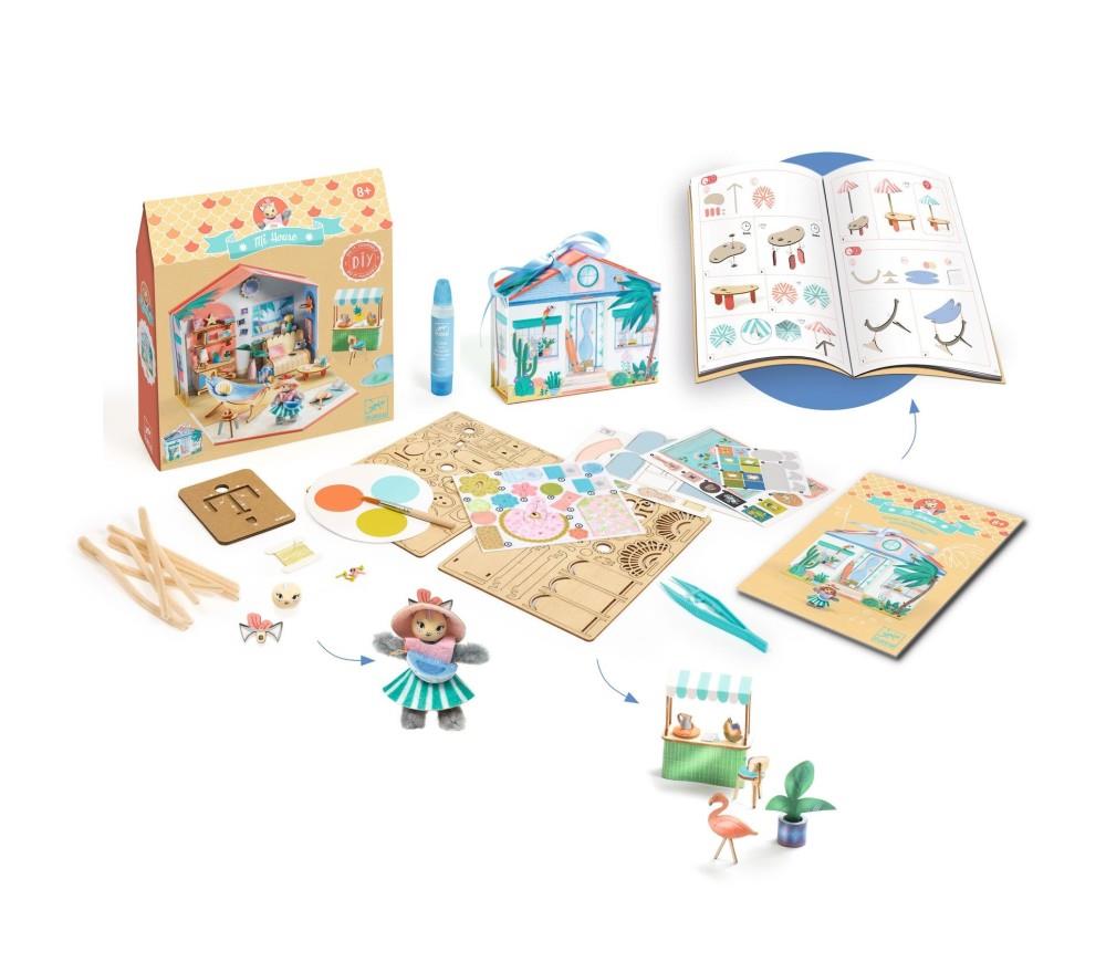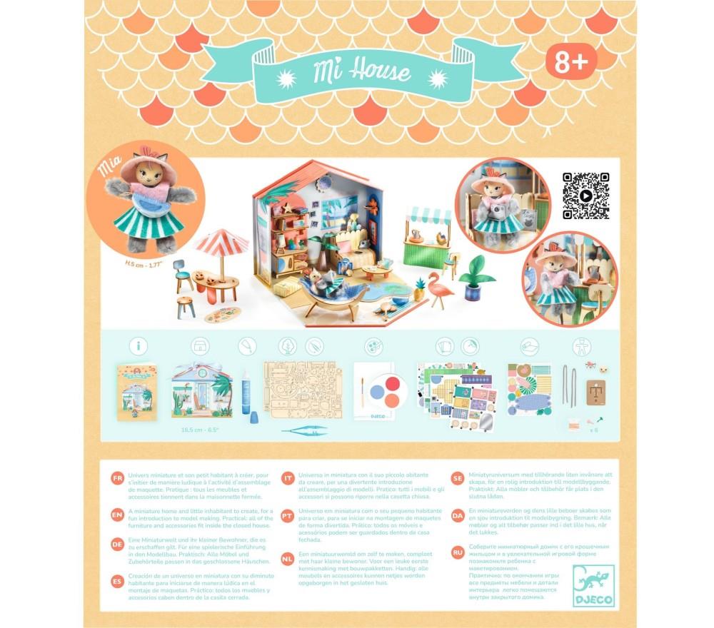 Mi House Mia - Mi House è la nuovissima linea di Djeco che avvicina i bimbi all'arte del modellismo e delle miniature. Con questo kit i bambini potranno dipingere e assemblare mobili e accessori per creare una meravigliosa casetta in miniatura. Il libretto di istruzioni e un video guidano i bimbi passo dopo passo per creare un meraviglioso piccolo mondo, ricchissimo di dettagli. Una volta finita la parte creativa… largo all'immaginazione! Con il personaggio incluso i bambini potranno inventare mille e più storie, vivendo fantastiche avventure! Questa è la casetta della gattina Mia, che adora passare il tempo all'aria aperta tra spiaggia, chiosco con tante prelibatezze, fotografie e sport, ma non disdegna anche un po' di relax sull'amaca! Contenuto della confezione: 1 casetta (dimensioni chiusa: 14,5 x 16,5 x 5 cm), 2 assi di legno tagliate al laser, 1 tavolozza di pittura a secco e 1 pennello, 1 tovaglia protettiva, 3 schede di carte pre-tagliate illustrate, 3 schede di adesivi (1 scheda di adesivi illustrati, 1 schede di piccoli adesivi trasparenti, 1 scheda di adesivi di gommapiuma double face), 4 scovolini di ciniglia, 1 testa e le orecchie illustrate di legno, 1 bobina di filo, 1 scheda di elementi di feltro illustrati pre-tagliati, 6 fermacampioni, 1 strumento di cartone per fabbricare i mini personaggi, 1 pinza di precisione, 1 tubo di colla liquida con punta fine, 1 libretto di istruzioni passo passo.
