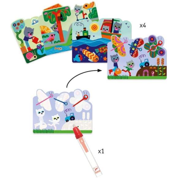 Colori magici di Djeco permette ai piccolissimi di colorare senza sporcare. Riempi la penna-pennello con l'acqua e inizia a colorare le schede, come per magia appariranno i colori e le sorprese e una volta asciutto puoi ricominciare! Pratico da portare in viaggio, in pizzeria, dai nonni. La confezione contiene 4 schede e 1 pennello ricaricabile.