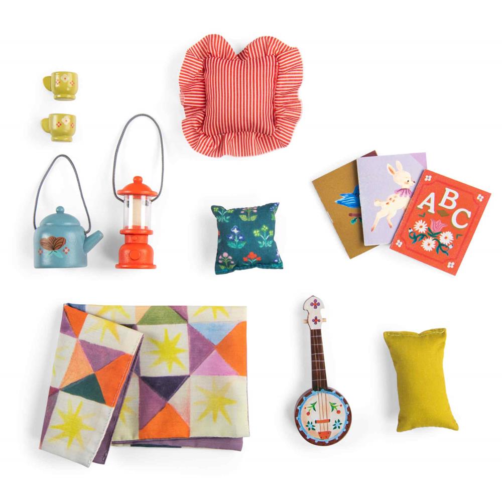 Oggi piove… evviva! Cuscini morbidi, una tazza di tè e libri di fiabe… l’occasione perfetta per Nine di invitare i suoi amici a casa. In un piccolo villaggio pieno di musica, danza e profumo di torta appena sfornata, vivono i Minouchkas: una tenera banda di personaggi articolati, ideati da Lucille Michieli. Contenuto: banjo, plaid, lanterna, teiera, 2 tazze in legno, 3 libri, 3 cuscini. Tessuto e Legno certificato FSC®. Dimensioni: 16 x 5,5 x 11,5 cm