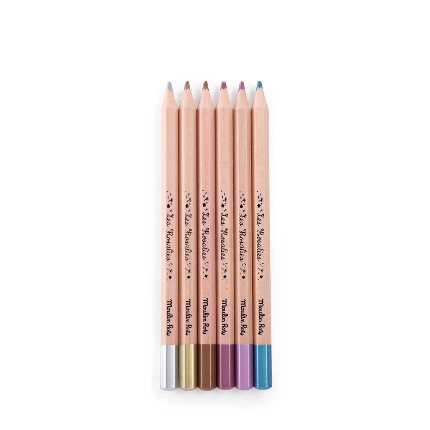 6 matite colorate metallizzate Les Rosalies, con mina morbida per illuminare i tuoi disegni e colorazioni. Per accentuare l'effetto metallico, optate per carta scura. Dimensioni: 6 x 1,05 x 18 cm