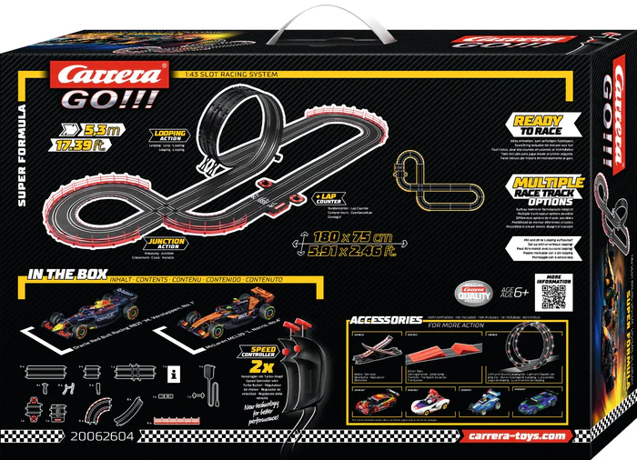 Con Carrera GO!!! ''Super Formula'' impostata, Max Verstappen con la Oracle Red Bull Racing RB21 ''M. Verstappen, No.1'' e Lando Norris con la McLaren MCL39 ''L. Norris, No.4'' si cimentano in duelli emozionanti. Sulla pista lunga 5,3 metri con rettilinei ad alta velocità, curve spettacolari e un anello, i giovani piloti provano la sensazione di far parte del mondo della Formula 1. I veicoli dettagliati garantiscono una vera e propria febbre da corsa. I veicoli dettagliati assicurano una vera e propria febbre da corsa, mentre i duelli testa a testa e le emozionanti manovre di sorpasso fanno salire l'adrenalina. La superiorità dei campioni del mondo incontra lo spirito combattivo di un talento emergente: questo set porta in pista velocità, azione e puro spirito competitivo. Perfetto per tutti coloro che amano il brivido della Formula 1! Lunghezza percorso: 5,3 metri. Superficie montaggio: 180 x 75 cm. Numero di giocatori: 2. Controllore manuale: 2. Scala: 1:43.