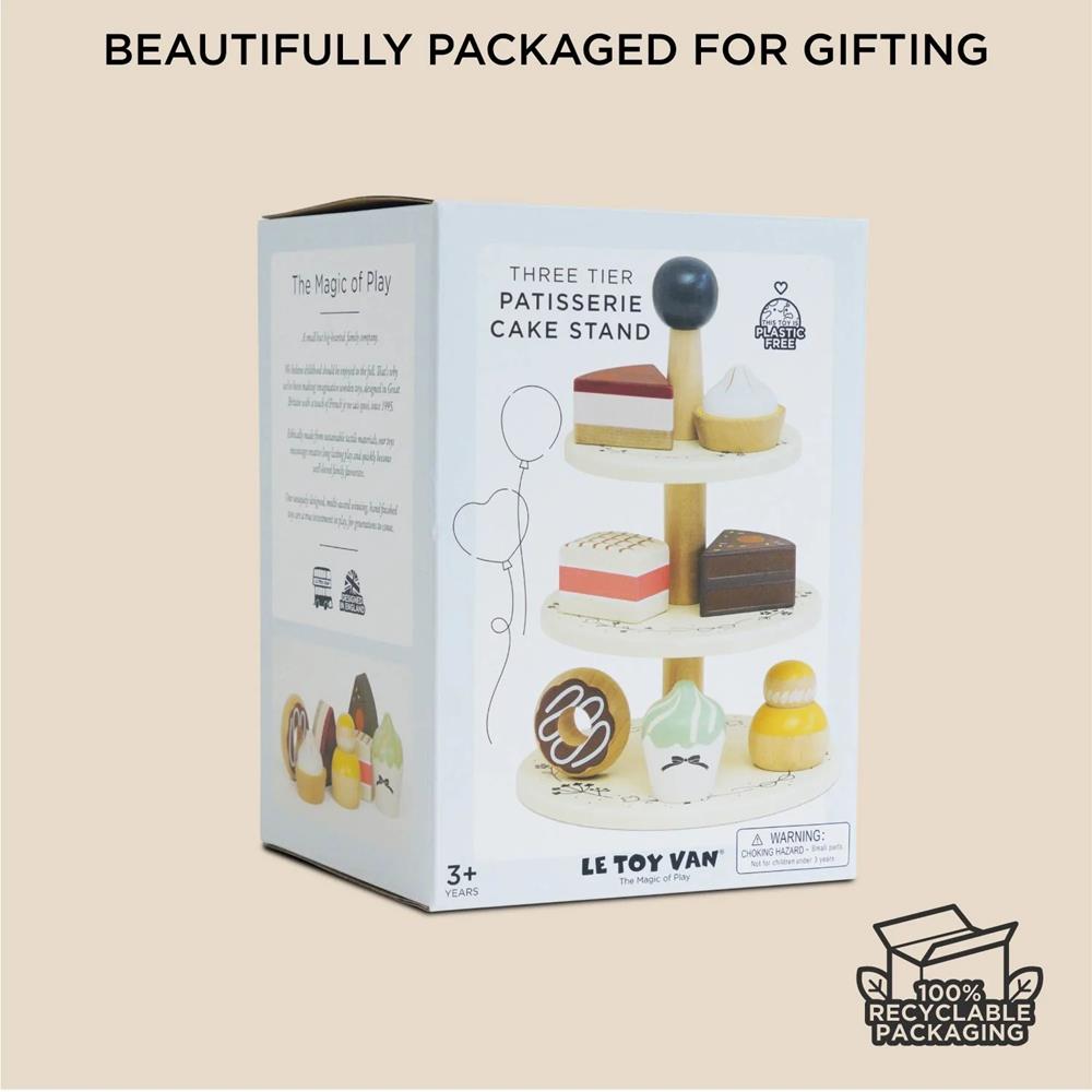 La nostra deliziosa alzata per torte a tre piani in legno certificato FSC® contiene una selezione di 7 prelibatezze, perfette per ogni occasione! Ogni piano di questa splendida alzata per torte presenta una diversa prelibatezza da leccarsi i baffi. Lasciate che le vostre papille gustative danzino mentre vi concedete un panino choux al limone e panna, stuzzicate i vostri sensi con una crostata meringata al limone e abbandonatevi all'irresistibile tentazione di una ciambella al cioccolato, una deliziosa torta a tre strati, un fantasioso cupcake a spirale, una deliziosa torta alla crema di lamponi e una ricca torta al cioccolato. Questo set di alzatine per torte non è solo esteticamente splendido, ma è anche realizzato in legno proveniente da fonti sostenibili ed è completamente privo di plastica! È decorato con vernici atossiche a base d'acqua o tinte per un gioco sicuro. Questo set divertente unisce eleganza, immaginazione, gioco di ruolo e divertimento in ogni casa! Dimensioni (LxPxA): 17,5 x 17,5 x 25 cm.