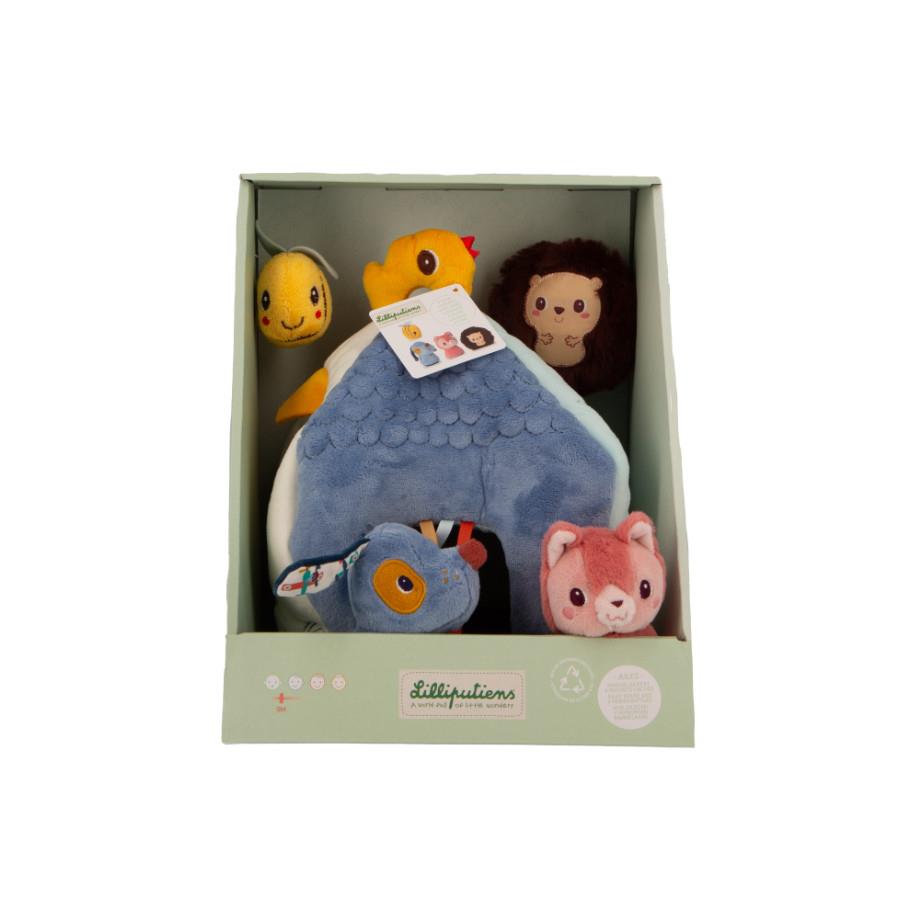 Questa colorata casettina è adornata con quattro aperture, ognuna accoglie un amico diverso: un cane, un gatto, un riccio e un'ape. Sono tutti e quattro sonaglini che emettono un suono unico. Ogni abitante è associato a un colore o un'illustrazione specifica sui lati della casa. Questo permette ai bambini di abbinare e associare mentre si divertono. In cima alla casa c'è un'adorabile maniglia a forma di uccellino. Questa casa è un gioco di attività e immaginazione dove le abilità sensoriali e cognitive si sviluppano in modo giocoso e gioioso.