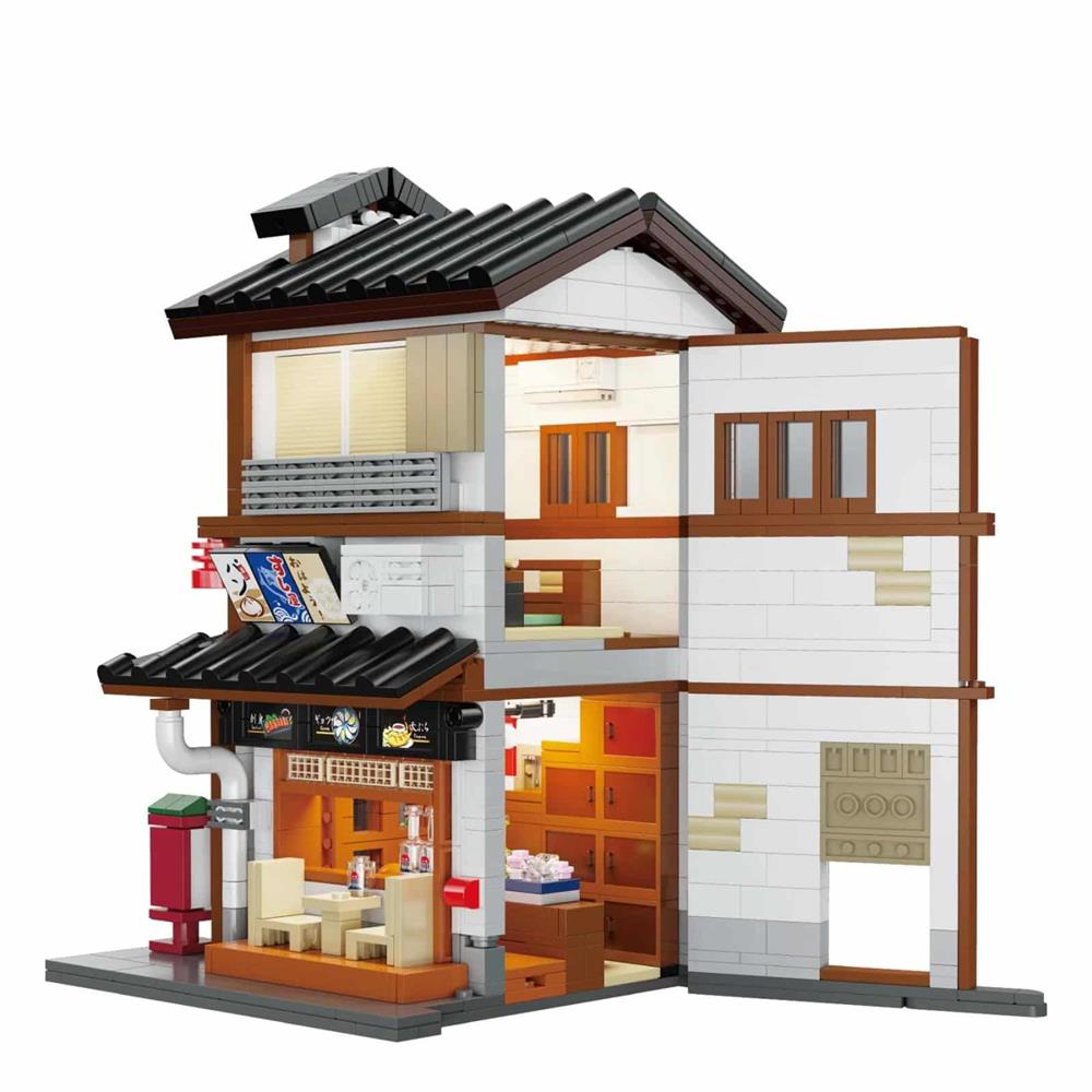Celebra l'atmosfera di un Izakaya di quartiere con il CaDA Japanese Corner Yakitori Izakaya Restaurant Bar. Questo dettagliato modello in mattoncini da 1.195 pezzi riproduce un tradizionale ristorante/bar giapponese all'angolo. Yakitori si riferisce agli spiedini di pollo alla griglia, mentre un izakaya è un luogo rilassato dove gustare cibo e bevande con gli amici. Il modello presenta porte e finestre apribili, ed entrambe le pareti laterali possono essere completamente aperte per un facile accesso all'interno. L'illuminazione interna a LED ambientale esalta l'atmosfera serale. Il lato destro del modello è progettato per collegarsi ad altri edifici giapponesi della gamma CaDA.