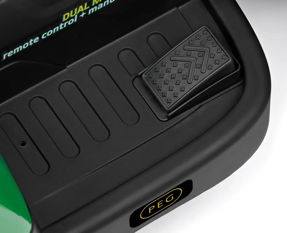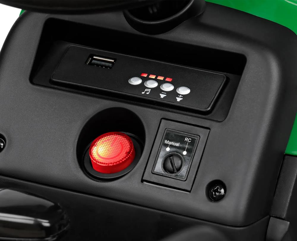 Il trattore elettrico con rimorchio guidato dai bambini e radiocomandato dai grandi! John Deere Farm Power è il trattore elettrico più desiderato dai piccoli e… dai grandi. Da 18 mesi a 3 anni il trattore può essere condotto da un adulto tramite radiocomando; dai 3 anni può essere guidato dai bimbi per fantastiche avventure. Il radiocomando consente di controllare il veicolo a distanza, scegliendo tra tre velocità e muovendolo in quattro direzioni diverse. Dai 3 anni, il bambino può prendere il controllo a bordo del veicolo, guidandolo in autonomia con due velocità di percorrenza e la retromarcia. Il cruscotto elettronico con pulsante ON/OFF include musiche preimpostate e attacco USB. Una striscia di LED mostra lo stato di carica della batteria. Il sedile garantisce una seduta confortevole ed è dotato di cintura regolabile per seguire la crescita del piccolo conducente. Il pedale acceleratore, una volta rilasciato, diventa un freno che arresta automaticamente il giocattolo. Fantastiche le luci anteriori e posteriori, le accendi quando servono! Rimorchio con sponde alte e lato aperto per il carico e lo scarico facilitato. Viaggia alla grande grazie alla potenza delle 2 ruote motrici da 70W totali con battistrada tassellato. Funziona con una batteria ricaricabile al Litio da 12V / 3,1Ah / 37,2Wh.