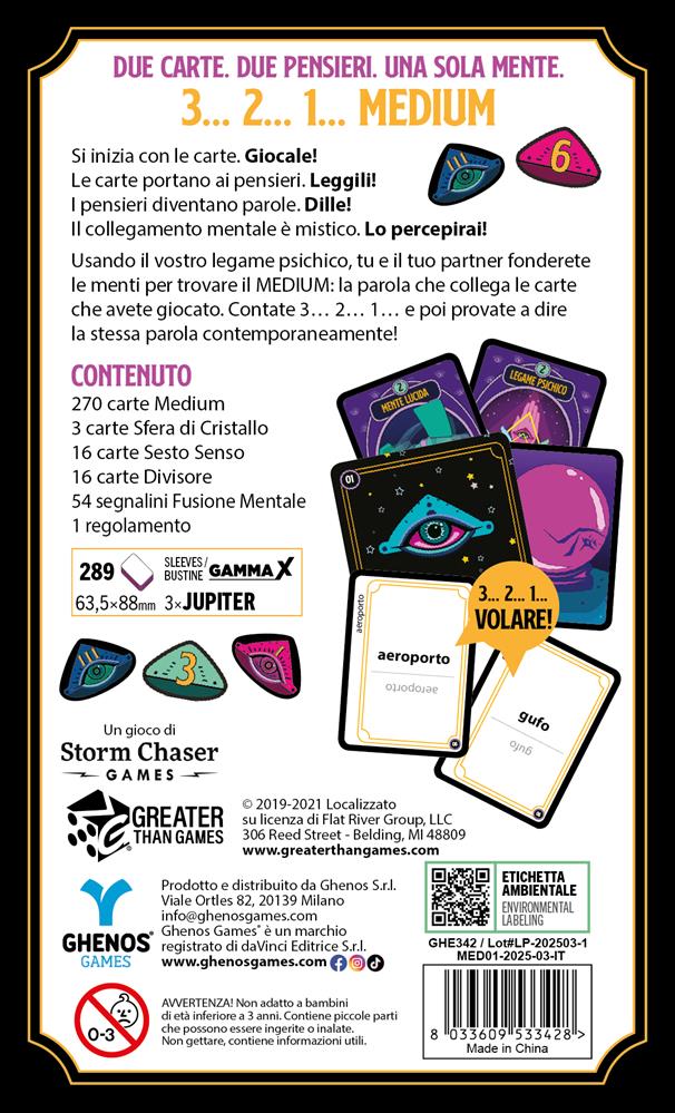 Impersona un Medium e affina le tue abilità psichiche per leggere la mente dei tuoi amici. Riuscirai a fondere la mente col tuo partner e a pronunciare la stessa parola? Medium è un party game da giocare in famiglia o con amici. Attingerai alle tue straordinarie capacità extrasensoriali per comunicare mentalmente con i tuoi compagni. Tu e un partner dovrete pensare assieme al Medium, la parola che collega i due termini sulle vostre carte, e dirlo ad alta voce nello stesso momento. Prima dovrai giocare con la persona alla tua sinistra e poi con quella alla tua destra. Quando viene pescata la terza e ultima carta Sfera di Cristallo, essa andrà in frantumi, interrompendo la connessione psichica fra i giocatori. La coppia con più punti vince! Contenuto: 270 carte Medium. 3 carte Sfera di Cristallo. 16 carte Sesto Senso. 16 carte Divisore. 54 segnalini Fusione Mentale. Regolamento. Giocatori: 2-8. Durata: 30-40 min.