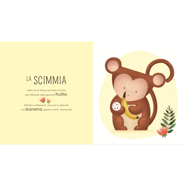 Chi c'è nella giungla? Un libro sonoro con illustrazioni dai delicati colori pastello e dolci rime per far conoscere ai più piccoli i versi degli animali. Tra la fitta vegetazione della giungla si aggirano tantissimi animali: scopri quali sono sfogliando le pagine di questo libro e premi i bottoni per conoscere i loro versi! Pagine: 12. Autore: V. Manuzzato & V. Bonaguro.