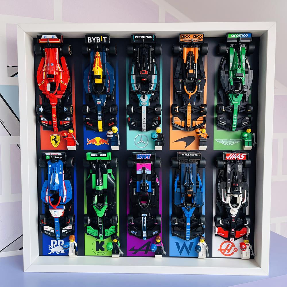 Formula Frame BIG Edition – La cornice definitiva per tutta la tua collezione di modelli F1. Hai completato la collezione LEGO® Speed Champions di Formula 1? Con la nuova Formula Frame – Big Edition, puoi finalmente esporre tutti e 10 i bolidi delle scuderie e i relativi 10 piloti, in un display pensato per colpire, raccontare e celebrare la passione per la F1 in versione mattoncino. Ogni cornice è realizzata artigianalmente e progettata per contenere in modo ordinato ed elegante i set LEGO® dal 77242 al 77251, con uno sfondo esclusivo che richiama tutte le 10 scuderie ufficiali rappresentate. Un vero “podio murale” per la tua collezione! Capienza massima: 10 auto + 10 minifigure LEGO® F1 (set 77242–77251) Dimensioni: 52x52x6 cm. Realizzata in legno laccato. Spazio utile interno di oltre 5cm. Vetro/plexiglass anteriore antipolvere da 2mm. Gancio posteriore per appenderla a muro.