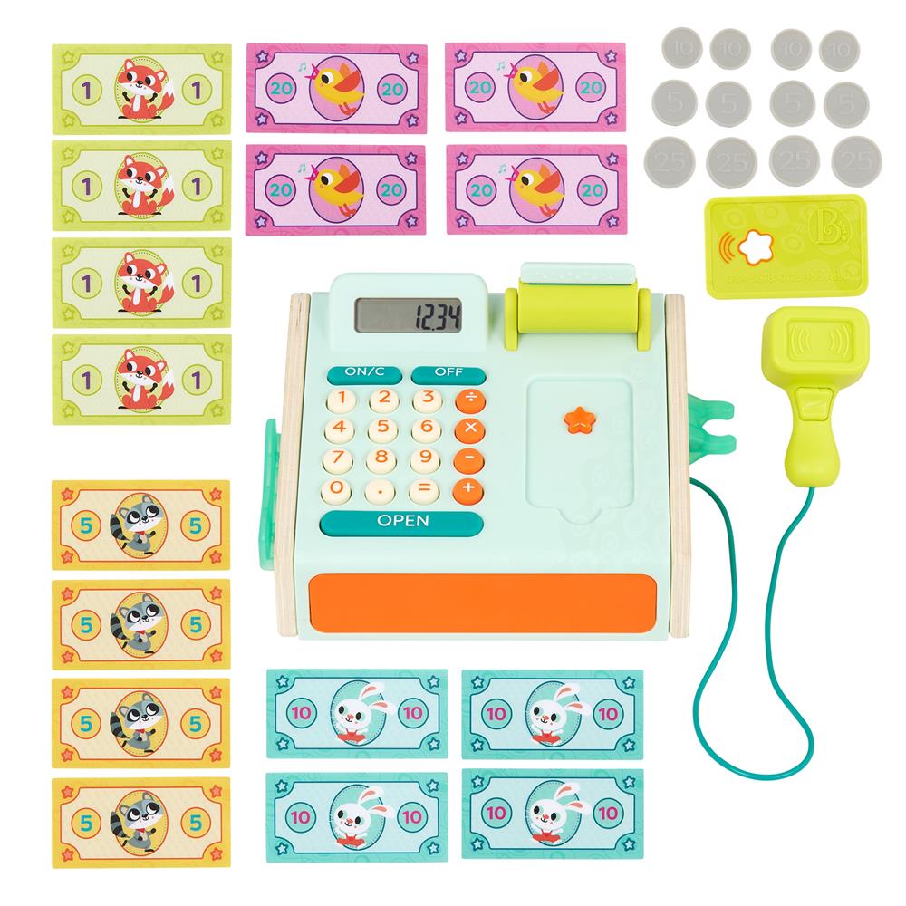 Scansiona, conta, striscia e gioca con il mini registratore di cassa di B. toys by Battat! Questo coloratissimo registratore di cassa include tutto il necessario per far giocare i bambini nel loro negozio immaginario: uno scanner, una carta di credito, monete da 25 centesimi, 10 centesimi, 5 centesimi, banconote da 20 dollari, 10 dollari, 5 dollari, 1 dollaro e uno scontrino retrattile. I piccoli cassieri possono scansionare articoli immaginari, calcolare il prezzo totale con l'aiuto di una vera calcolatrice, strisciare una carta di credito o dare il resto ai clienti aprendo il cassetto dei contanti. Questo registratore di cassa giocattolo è dotato di pulsanti facili da premere, divertenti effetti sonori e una stella luminosa! Inoltre, giocare con questo set da cassiere migliora le abilità sociali, sviluppa la manualità e insegna ai bambini ad addizionare, sottrarre, moltiplicare e dividere.