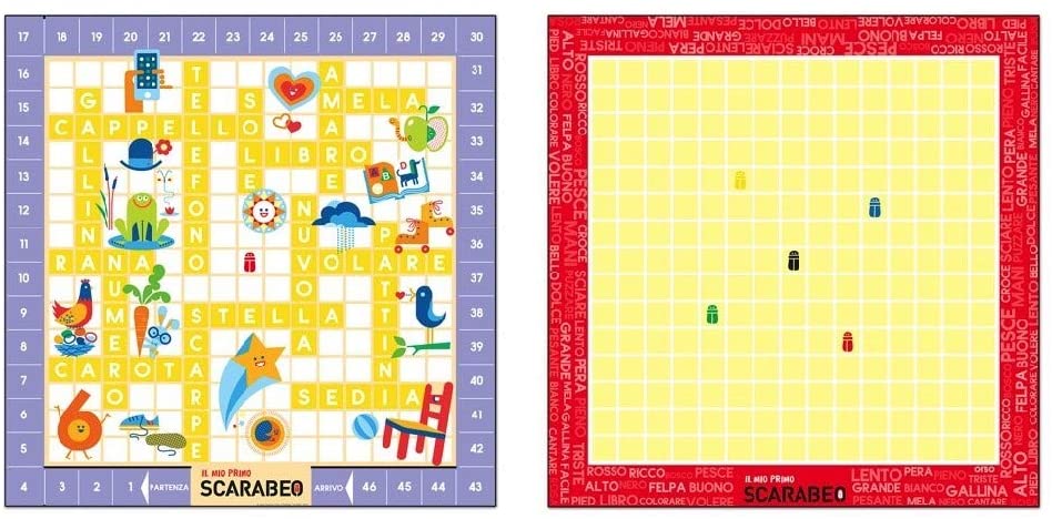 Una versione di Scarabeo dedicata ai più piccini. Ci sono infatti due modalità di gioco che permettono di far divertire Bambini dai 4 ai 7 anni! 1 modalità di gioco PRESCOLARE: con una plancia facilitata vede i giocatori sfidarsi al riconoscimento delle lettere presenti nelle parole stampate e raffigurate sulla plancia. Dopo aver distribuito ai giocatori 8 lettere, ad ogni turno i giocatori devono posizionare almeno due delle proprie lettere corrispondenti sulla plancia, per poter muovere il proprio segnalino lungo il percorso segnapunti. Il primo a raggiungere l’arrivo vince! 1 modalità classica ma guidata per giocatori in ETÀ SCOLARE: partendo dalla parola SCARABEO posizionata al centro della plancia, ad ogni turno i giocatori devono formare nuove parole di senso compiuto intersecandole. Ogni scheda porta lettere riporta diverse parole suggerite, per aiutare/stimolare i giocatori in erba. Il mio primo Scarabeo è stato studiato e realizzato per coinvolgere i bimbi nella loro prima scoperta delle lettere e delle parole!