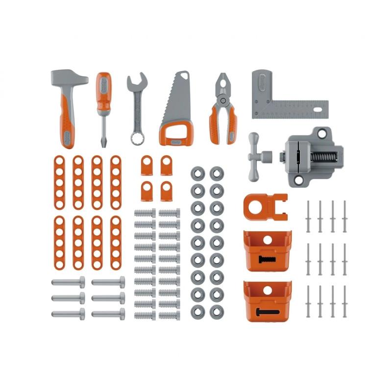 Banco da lavoro Bricolo è un banco da lavoro completo per imparare il fai da te. Ampie aree di stoccaggio (inclusi 2 contenitori). 7 Strumenti (sega, martello, chiave inglese, cacciavite, pinze, squadra, morsa). 20 Viti - 18 Dadi - 6 Chiodi - 1 Set di Tavole da Costruzione (6) - Funzione Tap/Tap Nail - 1 Ampio vassoio per sperimentare un nuovo approccio al design senza aggregati di plastica, per ridurre gli sprechi di plastica e offrire ai consumatori un giocattolo pronto all'uso. Realizzato in plastica riciclata.