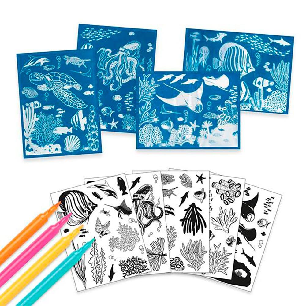 Questa magica attività si ispira a un procedimento preso in prestito dalla fotografia: la cianotipia. Con l’aiuto di motivi opachi, il bambino o la bambina crea scene illustrate su carta fotosensibile. Dopo l’esposizione al sole la carta è contrassegnata da motivi in negativo. Bisogna solo risciacquare la carta in una vasca con acqua pulita e le creazioni si rivelano su fondo blu! Con 4 pennarelli per trasformare i 4 quadri in fondali sottomarini multicolore.