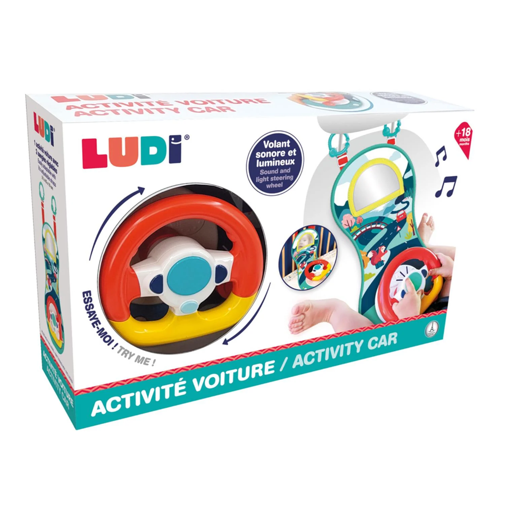 Tutti a bordo per fantastiche avventure! Questo grande pannello attività intratterrà il tuo bambino durante i lunghi viaggi in auto. Il bambino potrà divertirsi a fingere di guidare come un adulto. Il volante con luci e suoni aggiunge ancora più divertimento: suoni del motore, clacson e indicatori di direzione. Uno specchietto gli permetterà di ammirarsi o fare smorfie divertenti. Il pannello è regolabile grazie alle cinghie e ai due anelli di fissaggio. Puoi portarlo e appenderlo ovunque: in auto, a letto, nel passeggino, ecc. Richiede 3 batterie AA (non incluse). Dimensioni: 21 x 43 x 10 cm. Composizione: ABS e poliestere. Pulire con un panno umido.