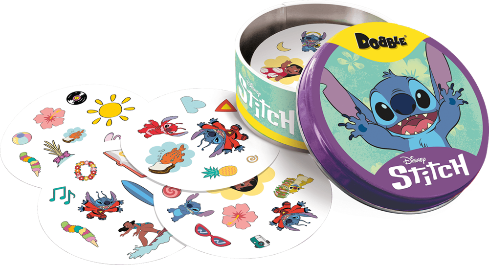Dobble Stitch. La nuovissima versione di Dobble a tema Stitch! Dobble è più di 50 simboli, 55 carte, 8 simboli per carta e sempre un solo simbolo in comune tra due carte qualsiasi. Sta a voi trovare quale. Giocatori: 2-8. Durata: 15 min.