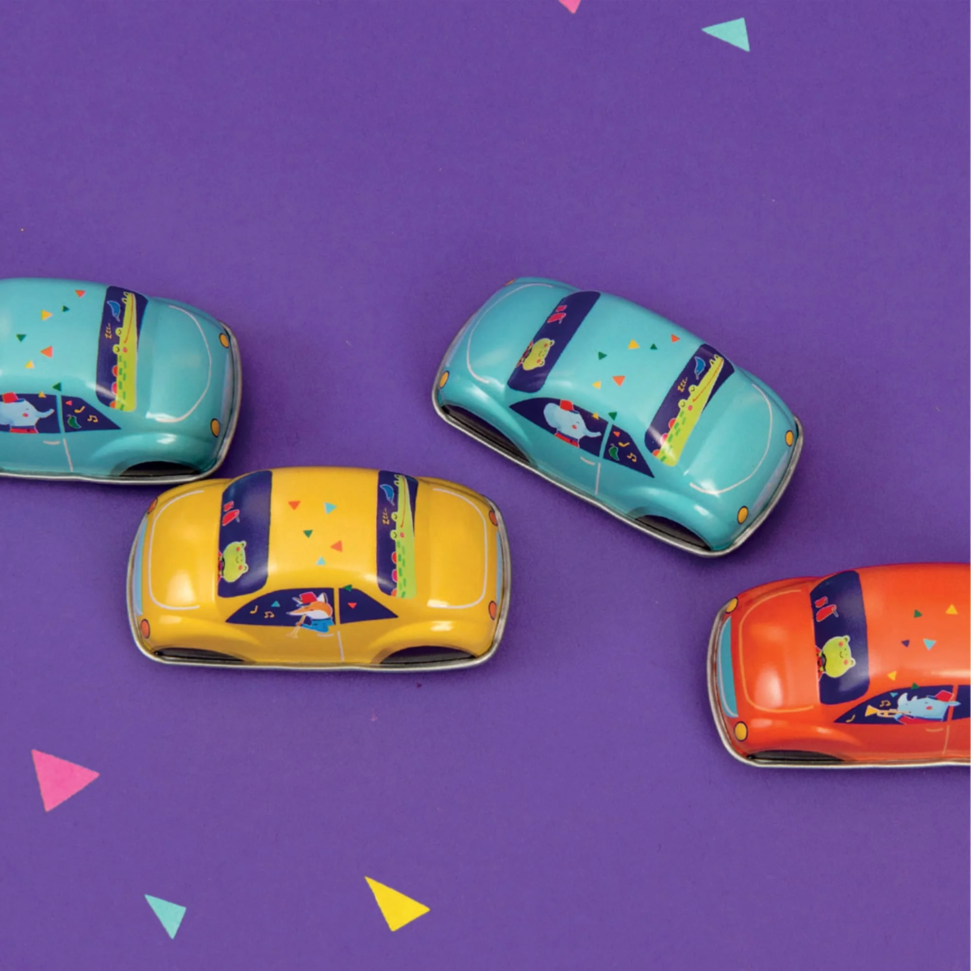 Queste macchine gialle, a frizione sono realizzate in latta e illustrate a tema della banda musicale con animali colorati e allegri. Tira la macchina indietro (con un po' di pressione) per caricarla e vedi come corre veloce! Dimensioni: 8,5 x 4,5 x 4 cm.