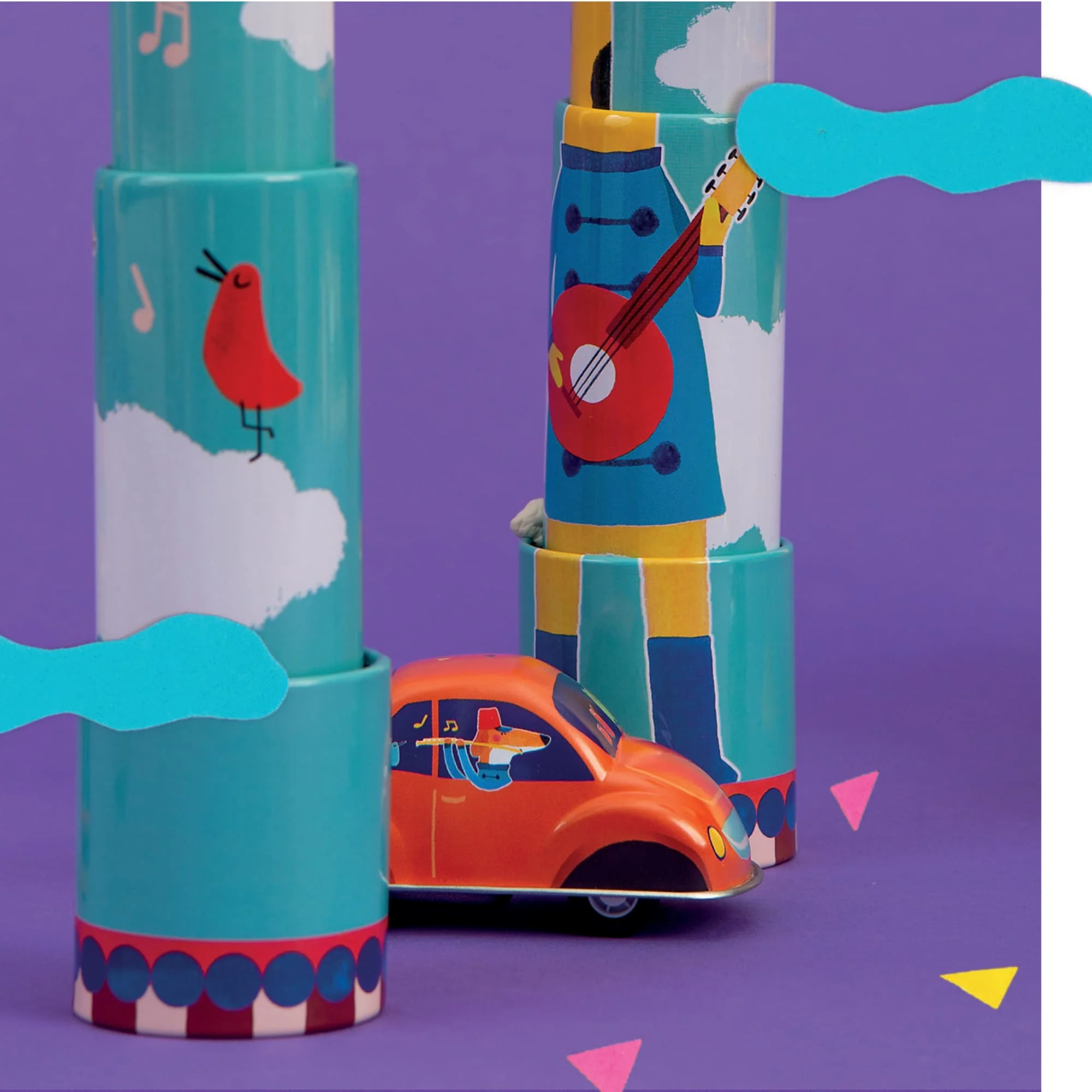Queste macchine arancioni, a frizione sono realizzate in latta e illustrate a tema della banda musicale con animali colorati e allegri. Tira la macchina indietro (con un po' di pressione) per caricarla e vedi come corre veloce! Dimensioni: 8,5 x 4,5 x 4 cm.