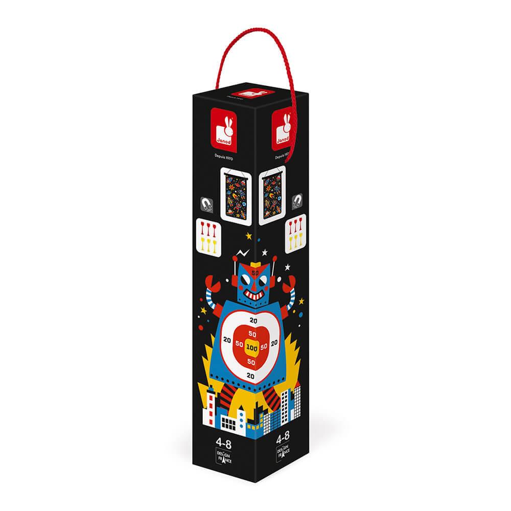 Una partita a freccette con la famiglia, in tutta sicurezza per i più piccoli, che ne dici? Questo gioco di abilità universale è molto intelligente! Grazie a un bersaglio e freccette magnetiche, anche i bambini dai 4 anni potranno assaporare le gioie della competizione. Con questa versione, tuffati nel mondo dei robot e prova a raggiungere i 100 punti giocando abilità e destrezza! Questo gioco di freccette magnetiche ti offre 2 livelli di difficoltà: un lato stampato con un robot gigante che invade la terra o navi e pianeti più difficili e sparsi da raggiungere grazie alle 6 freccette incluse (3 rosse e 3 gialle). Grazie al suo cavo, è facile da appendere e si conserva facilmente nella sua scatola avvolgendolo.
