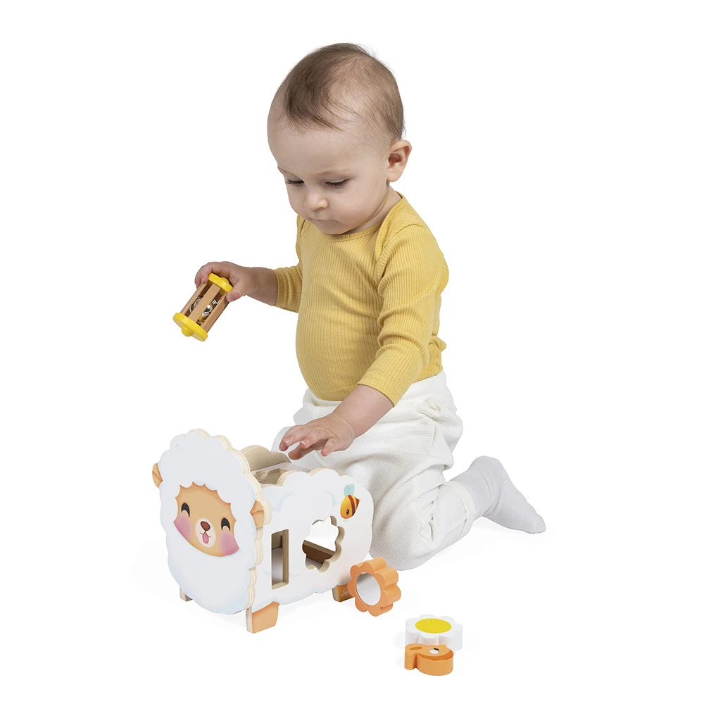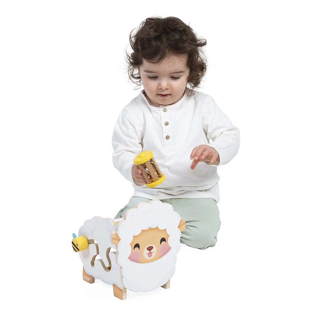 Quanto è carina questa rustica pecora di legno! Fiori, un'ape, una farfalla... c'è tutta la natura! Questa pecora multi-attività offre tanti giochi che delizieranno i bambini dai 12 mesi in su. Sul davanti, incastonato vicino alla testa, c'è un piccolo uccellino magnetico che i bambini possono divertirsi a rimuovere e rimettere a posto a loro piacimento. Su un lato, c'è un gioco di forme dove i bambini possono posizionare tre fiori. Questa attività richiederà un po' di ingegno da parte dei più piccoli per capire come disporre le forme. La parte migliore? Ogni fiore ha una superficie unica da esplorare: uno specchio, un'area per grattare e un pannello in plexiglass trasparente per vedere il mondo in arancione! Sul lato opposto, c'è un piccolo labirinto con un'adorabile ape di legno. La sfida per il bambino? Guidarlo lungo il percorso! Una farfalla può essere avvitata sul dorso della pecora, permettendo ai più piccoli di fare le loro prime esperienze con la rotazione. Proprio accanto, c'è un piccolo spazio per un sonaglio: il bambino può afferrarlo, scuoterlo e ascoltarne il dolce tintinnio. È perfetto per stimolare l'udito fin dalla più tenera età. Progettato con cura, i 6 accessori che compongono questo giocattolo possono essere riposti anche all'interno!