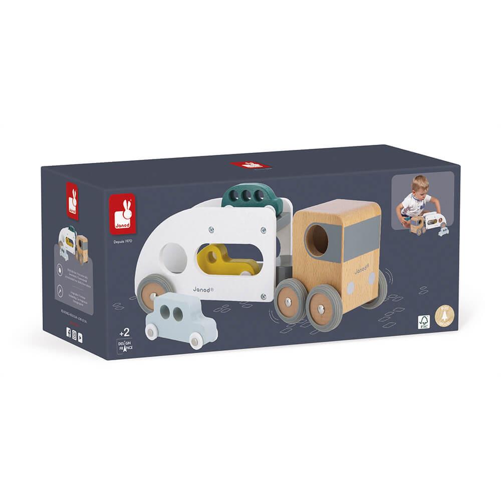 Suona la sirena! Le vetture devono salire sulla bisarca! Questo camion trasportatore e le sue tre piccole automobili (blu, verde e gialla) conquisteranno tutti gli appassionati di veicoli! La bisarca è dotata anche di un rimorchio bianco removibile e di ruote in gomma silenziose. Grazie al suo ampio angolo di sterzata passerà ovunque! Questo set di camion e automobili permetterà ai bambini dai 2 anni in su di sviluppare l'immaginazione e le abilità fino-motorie. Questo giocattolo è fabbricato in legno massiccio certificato FSC® e dipinto con vernici ad acqua.
