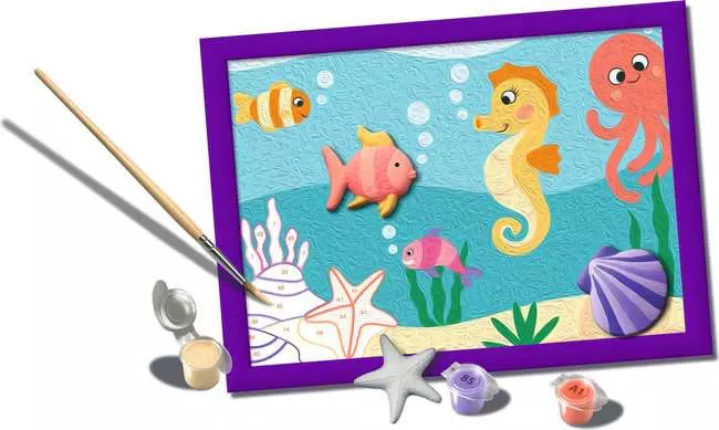 Immergiti nei colori dell'oceano con questo splendido set ''Dipingere con i Numeri'' che ritrae un variopinto Cavalluccio Marino e altri pesciolini. Un soggetto magico e ricco di dettagli, ideale per i giovani artisti che amano il mondo sottomarino.