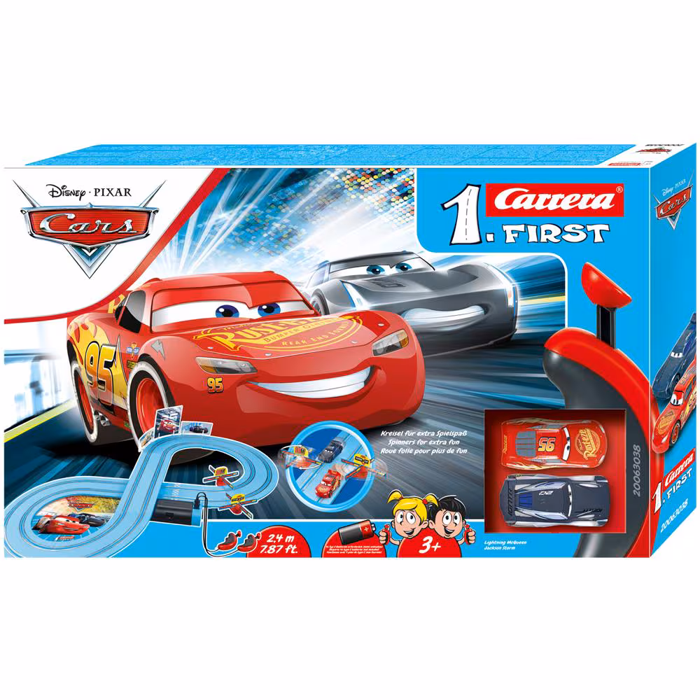 Gare divertenti con le stelle di Disney Pixar Cars – Saetta McQueen e Jackson Storm iniziano la loro emozionante avventura nella Carrera PRIMA “Disney Pixar Cars – Power Duel” nel duello dei giganti dei piccoli piloti da corsa da 3 anni. I due sono concorrenti su una pista nei famosi film per bambini, ma mostrano sulla pista da corsa lunga 2,4 metri che possono divertirsi insieme.