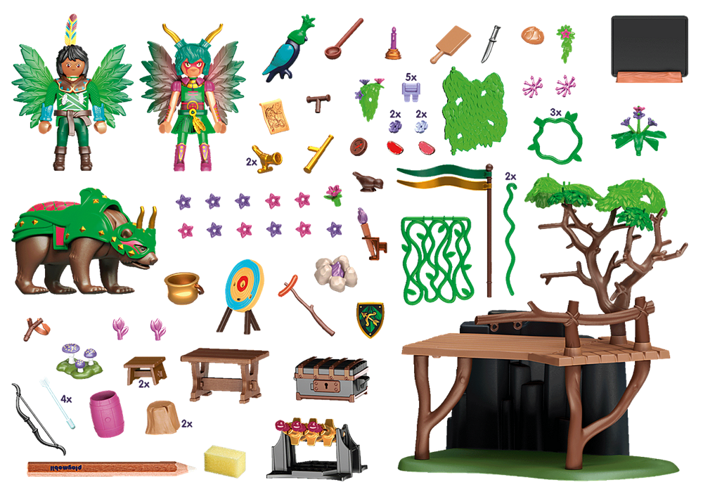 Nel campo di addestramento, le fate e gli animali possono esercitare le loro speciali abilità. Qui sono presenti pareti per arrampicarsi, bersagli per esercitarsi nel tiro, una sala per concentrarsi ed elaborare strategie di combattimento e tutto l'occorrente per preparare pozioni magiche. I sinistri piani delle oscure Bat Fairies stanno mettendo il mondo delle fate in grande pericolo. Ecco perché le Knight Fairies e le loro magiche creature marine affinano le loro abilità speciali nel loro campo di addestramento. Allenano la tecnica di arrampicata e la resistenza sulle rocce e sulla rete di liane oscillante. Per migliorare la loro tecnica di tiro, c'è un bersaglio con arco e frecce e un cannone speciale per le fate. Non è così facile sparare i proiettili di polvere di fata attraverso gli anelli di liana. Le fate scrivono i loro piani strategici sulla lavagna. Grazie alla spugna, possono cambiare e rivedere il loro concetto più e più volte. Con così tanto allenamento, ci deve essere una pausa, così le fate usano la piattaforma di legno e si concedono un delizioso picnic per fortificarsi. Il set di personaggi da gioco contiene una Knight Fairy con un animale dell'anima orso Kodiak, un Knight Fairy uomo con un falco, un campo di addestramento con una piattaforma picnic e roccia di arrampicata, un cannone di polvere di fata con proiettili, un bersaglio, arco e freccia, una lavagna e molti altri extra emozionanti.