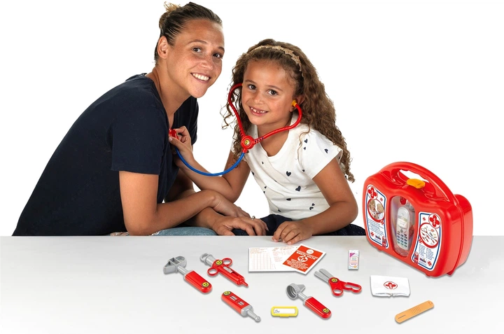 Con questa pratica valigia, i potenziali medici sono perfettamente attrezzati per tutti i tipi di incarichi. Possono usare lo stetoscopio per esaminare giocosamente il battito cardiaco, il termometro per verificare se il paziente ha la febbre e il piccolo martello per controllare i riflessi. Gli altri accessori aiutano a entrare nel ruolo e a rievocare scene emozionanti della vita quotidiana in ospedale.