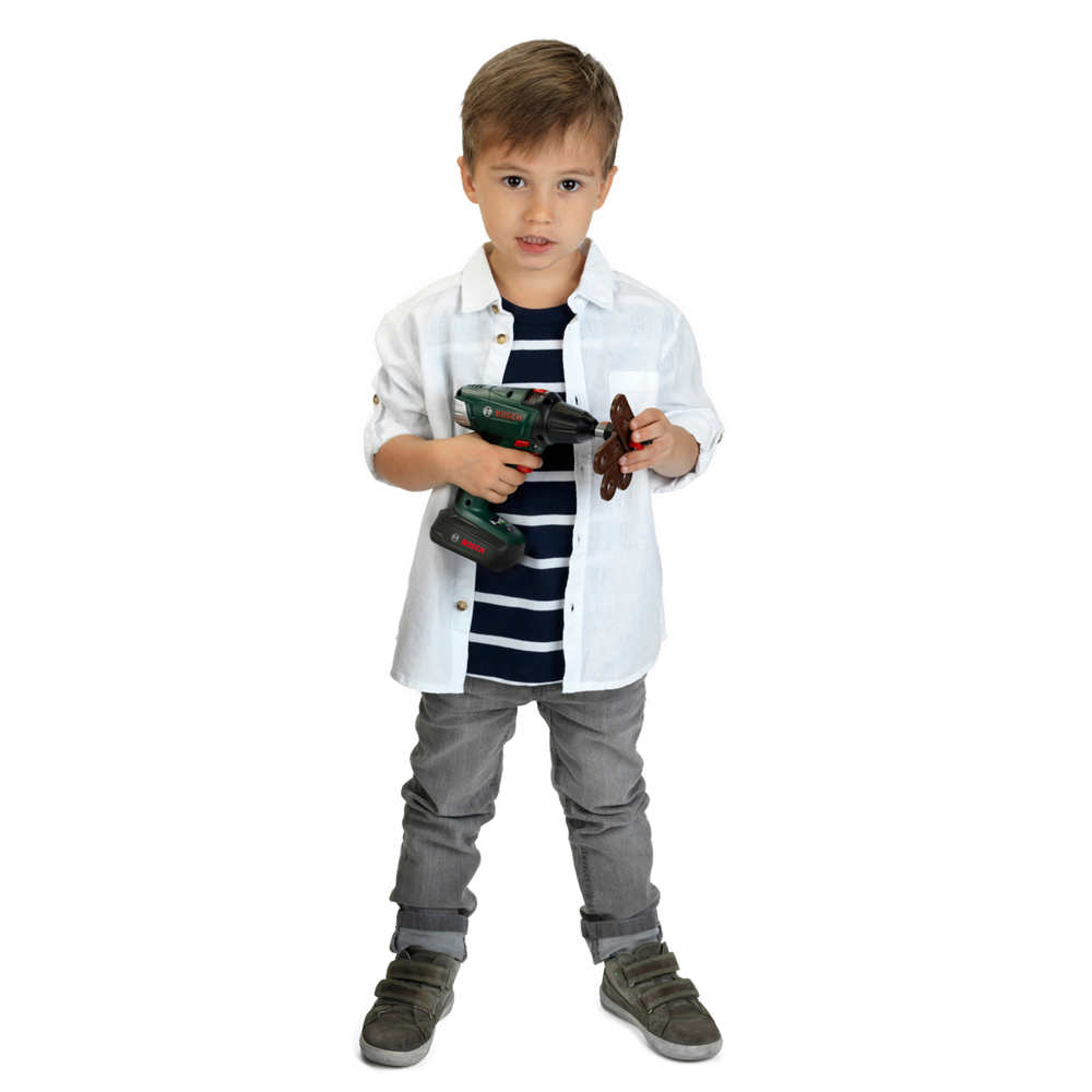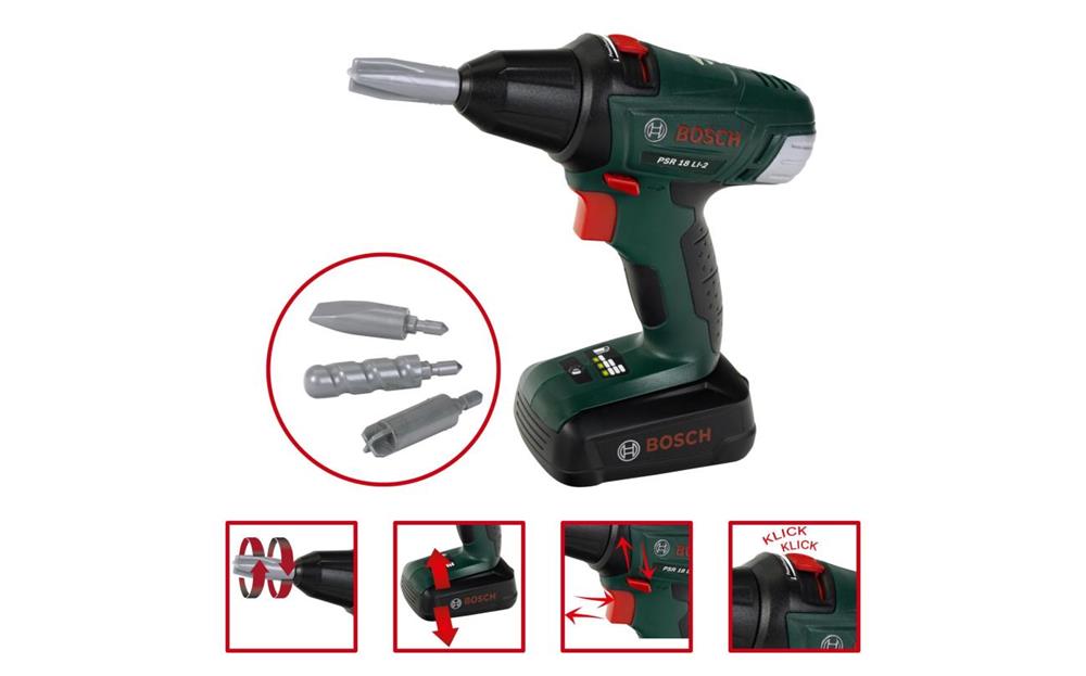 L’Avvitatore a batteria Bosch Giocattolo offre ai piccoli costruttori la possibilità di avvitare e svitare viti in totale sicurezza. Il trapano/avvitatore rotante è dotato di attacchi intercambiabili per afferrare ogni tipo di vite giocattolo e riproduce i rumori realistici di foratura e avvitatura. Costruito per garantire la massima sicurezza, non ha spigoli vivi e la rotazione avviene in modo lento e sicuro. Funziona con 3 batterie AA (non incluse).