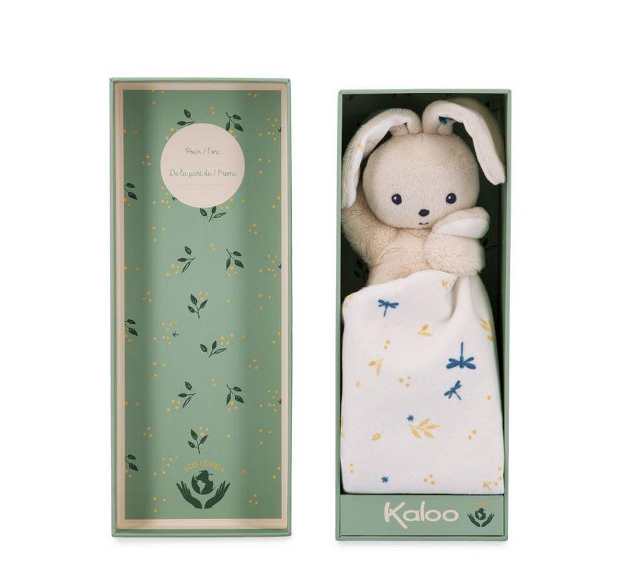 Questo coniglio con il suo morbido doudou quadrato diventerà il compagno irrinunciabile del neonato. Questo doudou è ecocompatibile al 100%, perché è composto da materiali riciclati a partire da bottiglie di plastica. Con il suo piccolo e soffice corpo in microvelour e le lunghe orecchie, il coniglio è facile da afferrare. Il doudou quadrato tra le sue zampette è decorato con piccole libellule che volano tra ramoscelli dorati. Questa stampa poetica e delicata è richiamata anche dalle orecchie del coniglio. L'elegante confezione in cui è presentato può essere utilizzata per riporlo. È il doudou perfetto per un regalo 100% ecologico.