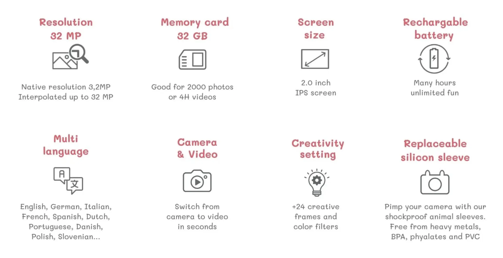 Questa fotocamera digitale per bambini e videocamera da 32 megapixel con design a forma di volpe di The Zoofamily è estremamente carina, piccola e leggera. Personalizza la fotocamera per bambini con adesivi e persino oltre 20 filtri e cornici digitali per fotocamera. La cover in silicone ecologico, senza PVC e senza ftalati, non è solo carina, ma protegge anche dalle cadute e mantiene la fotocamera pulita e può essere facilmente rimossa e lavata. Con la batteria ricaricabile integrata, può funzionare per ore prima che sia necessario ricaricarla. Completamente carica può scattare più di 2000 foto o registrare circa 4 ore. Il regalo perfetto per tutti i bambini! Caratteristiche:
