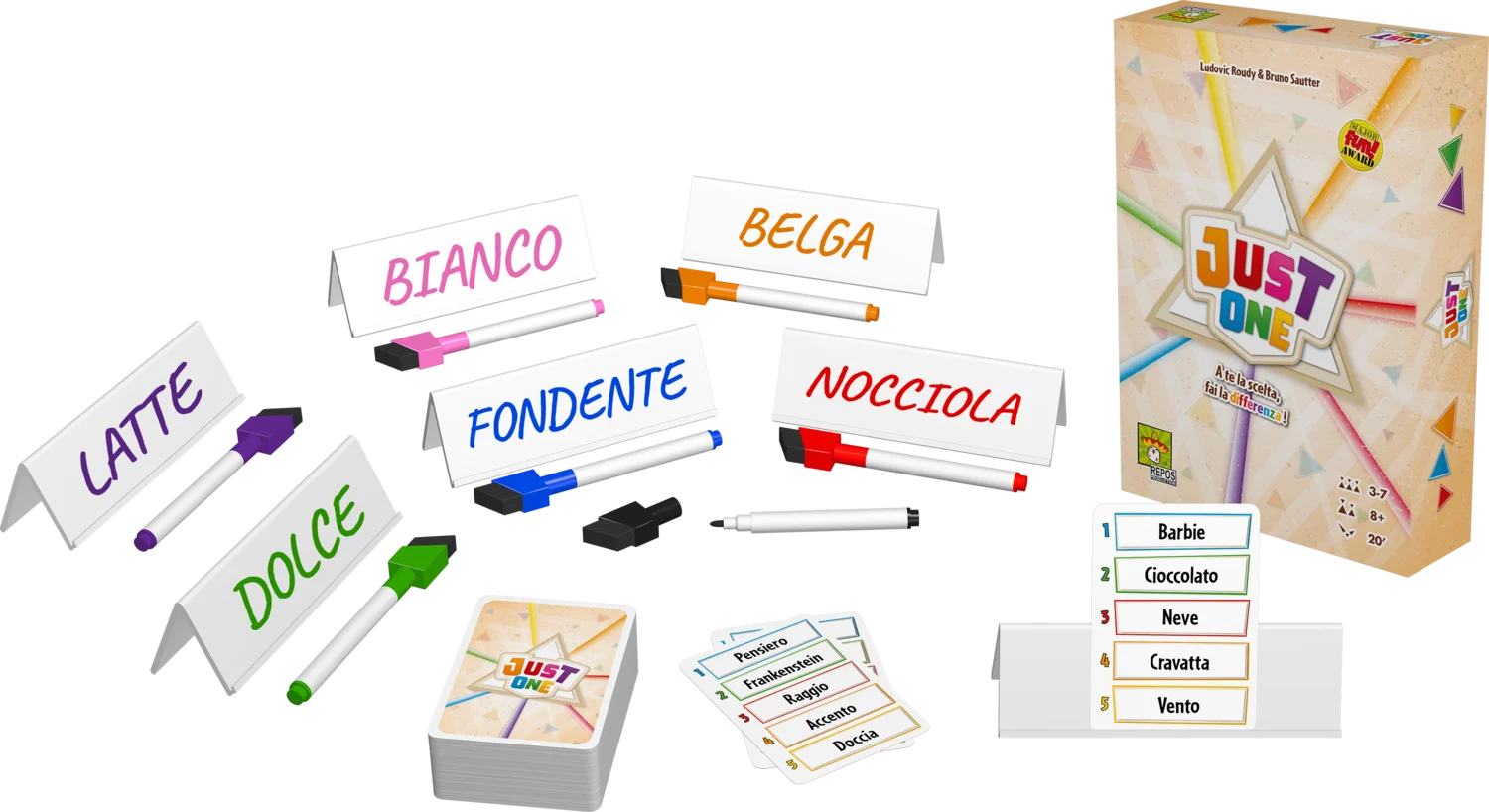 Indovina una parola segreta basandoti sugli indizi forniti dagli altri giocatori. Gioca con i tuoi amici per scoprire più parole Mistero possibili! Just One è un party game cooperativo. Insieme agli altri, fai indovinare una parola Mistero a uno dei giocatori scrivendo segretamente un indizio sul tuo cavalletto. Scegli il tuo indizio senza metterti d'accordo con gli altri e dai prova di originalità cercando di non scrivere lo stesso indizio di un altro giocatore. Tutti gli indizi identici, infatti, vengono annullati ancora prima che il giocatore attivo possa vederli. Alla fine della partita, calcola il punteggio in base al numero di parole Mistero indovinate. Contenuto: 110 carte. 7 cavalletti. 7 pennarelli cancellabili. 1 regolamento. Giocatori: 3-7. Durata: 20 min.