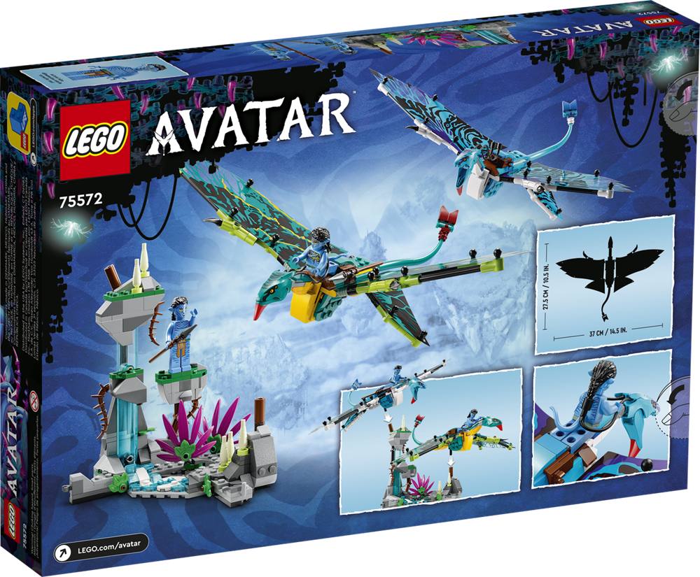 LEGO Il primo volo sulla banshee di Jake e Neytiri Avatar. Con 2 figure di Banshee costruibili, le 2 minifigure di Jake Sully e Neytiri, e gli elementi fluorescenti per le montagne, questo set LEGO Avatar riporta i bambini sul mondo di Pandora.