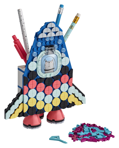 LEGO DOTS Portamatite - 41936. Questo kit di fai da te creativo include un alto portamatite blu e nero a forma di spazio, con una cornice a forma di finestrino apribile sul davanti per mettere foto o disegni.