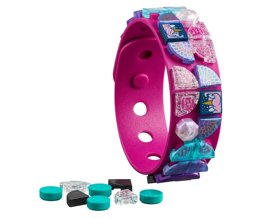 LEGO DOTS Braccialetto Unicorni per sempre. Questo kit di braccialetti fai da te per bambina e bambino LEGO DOTS include un braccialetto giocattolo regolabile di color magenta e tante tessere colorate, opalescenti e glitterate, a tema unicorno.