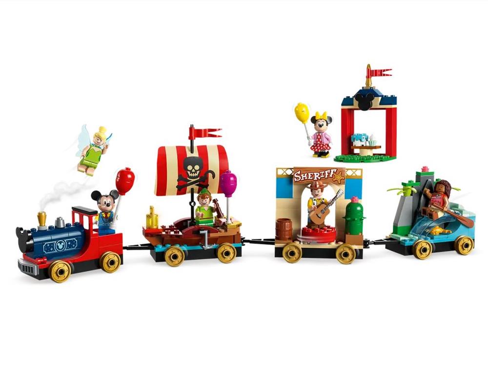 LEGO Disney Treno delle celebrazioni. Questo set LEGO Disney include un treno giocattolo da parata con 3 carri costruibili e 6 minifigure LEGO dei personaggi più amati, per celebrare il 100° anniversario Disney.