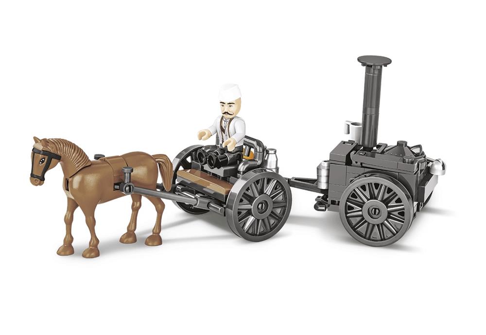Il modello di un carro trainato da cavalli tedesco con una cucina da campo. Il set comprende una figura di un cuoco dell'epoca e accessori realizzati con blocchi COBI (un mestolo, una tazza, una borraccia, una bottiglia e un rotolo). La cucina da campo può essere separata dal carro e dal cavallo. Il set dovrebbe essere di particolare interesse per le persone che stanno appena iniziando la loro avventura con i blocchi di costruzione COBI e tutti i collezionisti della serie Historical Collection, nonché i costruttori di diorami! La costruzione è anche una base ideale per la costruzione di carri trainati da cavalli con artiglieria. Cucine da campo quasi identiche sono state utilizzate durante la Grande Guerra e la figura inclusa con una stampa sul retro è molto versatile! Composto da 130 elementi di alta qualità, completamente compatibili con altre marche di blocchi di costruzione. I blocchi con stampe non si graffiano, non si macchiano e non si sbiadiscono durante il gioco o sotto l'influenza della temperatura.Istruzioni chiare e intuitive basate su illustrazioni e istruzioni dettagliate. Modello in scala 1:35 di un carro trainato da cavalli con cucina da campo.