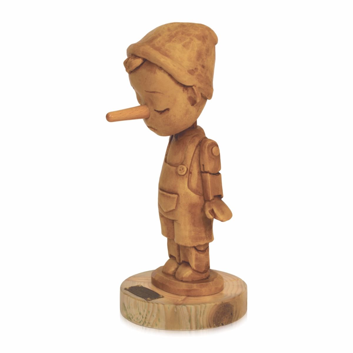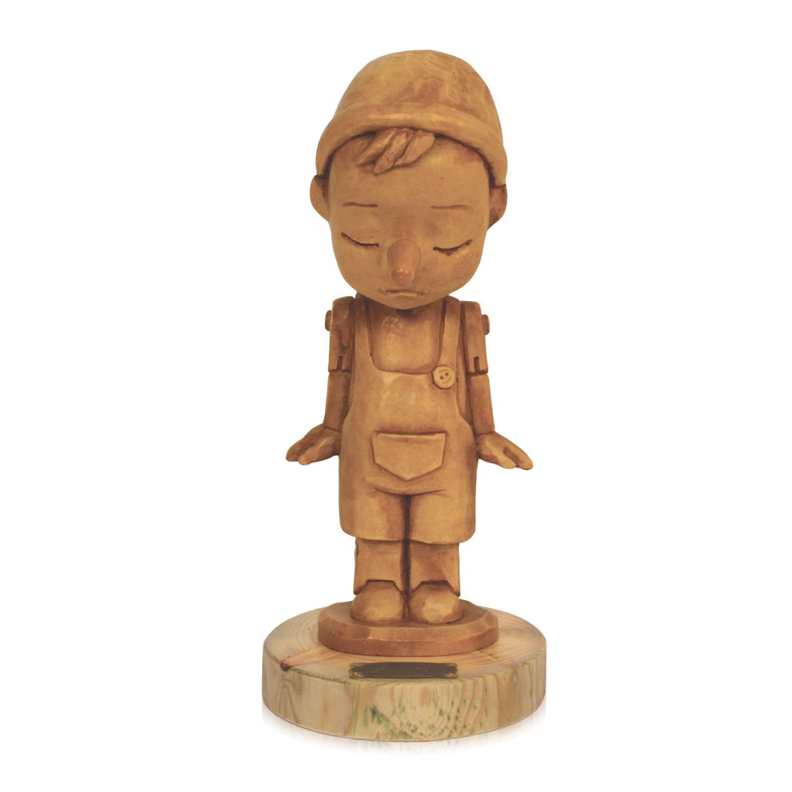 Pinocchio ''Pensiero'' realizzato in pasta di legno ed abete. Ogni pezzo viene tinto e assemblato a mano. L’innovativa composizione dei diversi materiali combina la tradizione del legno con le resine moderne, ciò consente di ottenere una coinvolgente espressione del volto e la precisa definizione dei vari dettagli. Ogni personaggio della nuova collezione esprime così un’emozione specifica e propone una riflessione sui diversi stati d’animo. Il basamento in abete invecchiato può avere le tipiche incrinature del vero legno naturale, pertanto ogni articolo diventa unico e irripetibile, a garanzia dell’artigianalità e dell’originalità dei prodotti Bartolucci