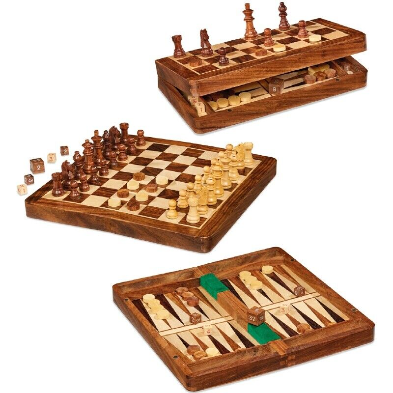 Scacchi Dama Backgammon con cofanetto in LEGNO pieghevole e magnetico dimensioni 30x15 Dal Negro.Contenitore scacchi/backgammon cm 30,5x15,2 con aree gioco intarsiate. Serie scacchi magnetici legno h. Re mm 57. 4 dadi cm 1,2. 1 dado raddoppio cm 1,8. Serie pedine Dama/Backgammon cm 1,8. Regole del gioco in 5 lingue