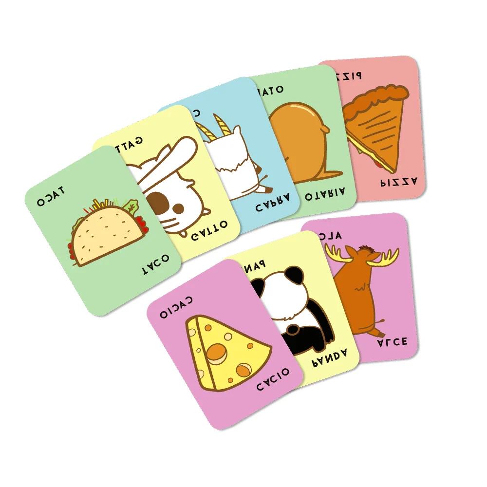Ripeti con me: TACO GATTO TORTA PACCO PIZZA. Ora imparale come il ritornello della tua canzone preferita ma… alla rovescia! Taco Dorso Torta Pacco Pizza è l’esilarante e frenetico party game che stavi cercando per divertirti con gli amici. Il piccolo formato ti permette di portarlo sempre con te e di rispondere alla domanda “Cosa facciamo?”. Niente più noia o indecisione, puoi giocare fino a 8 persone e coinvolgere anche i giocatori più inesperti. Provalo anche con genitori, zii e bambini: non sapranno resistere alle risate e alle coloratissime carte. Avrai forse un déjà-vu perché ricorda un goliardico gioco che tutti, almeno una volta nella vita, abbiamo fatto con le carte da briscola. Qui però si trasforma in un gioco di parole dove le carte hanno dei buffi e grandi disegni su sfondo color pastello ed uno spessore sottile che migliora la presa e la velocità. Sì perché oltre a recitare il ritornello, dovrai avere la mano più veloce degli altri per colpire la pila centrale e non rimanere l’ultimo. Penitenza: aggiungi tutte queste carte alle tue. Taco Dorso Torta Pacco Pizza è il party game spassoso che non può mancare nella tua collezione di giochi! Vince chi per primo rimane senza carte di fronte a sé. Contenuto del gioco: 64 carte disegnate a colori. Bustine protettive: 63.5 x 88 (64 carte). Numero Giocatori: 2-8. Durata: 10 minuti.