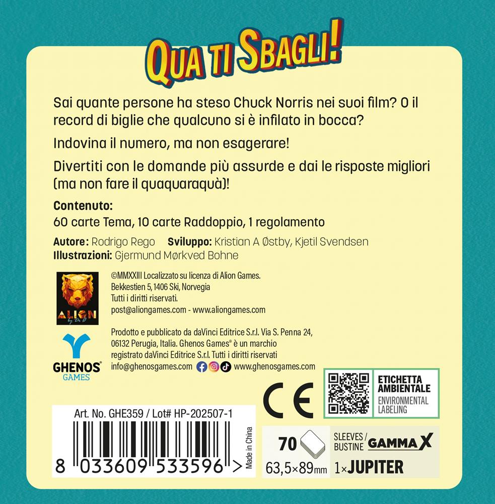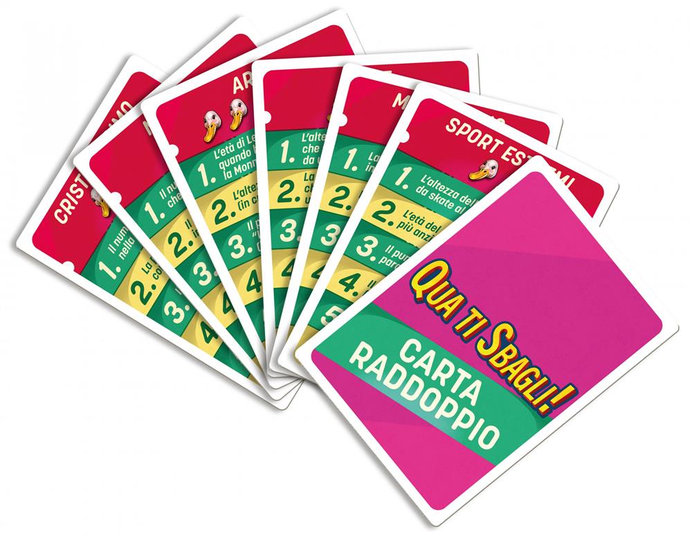 Qua ti sbagli! è un party game adatto a tutti e che si può giocare ovunque. Un giocatore legge ad alta voce la domanda della carta in cima al mazzo. Alle domande bisogna rispondere con un numero ritenuto inferiore alla risposta esatta ma che più vi si avvicina. Ogni giocatore può dire un numero superiore a quello detto dal giocatore precedente, oppure sfidare il giocatore precedente (se ritiene che la sua risposta sia troppo alta) dicendo “Sei un quaquaraquà!”. A quel punto viene girata la carta e controllata la risposta corretta. Se il valore era effettivamente troppo alto, il giocatore sfidato deve prendere la carta e metterla a faccia in giù davanti a sé. Se il valore non era superiore alla risposta: il giocatore che ha sfidato deve prendere la carta e metterla a faccia in giù davanti a sé. Perde solo il giocatore con più punti quaquaraquà! Contenuto: 60 carte Tema. 10 carte Raddoppio. 1 regolamento. Giocatori: 2-10. Durata: 15 min.