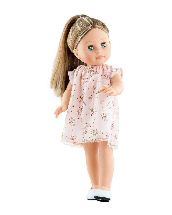 La bambola Esti è realizzata in vinile di alta qualità, senza etere ed è alta 42 cm. Il design della bambola è molto delicato e delicato. È morbida e piacevole al tatto, ha un bellissimo vestito floreale e capelli lunghi. L'outfit della bambola è completato da bellissime scarpe bianche. Le bambole Soy Tú di Paola Reina sono tutte bambole da gioco per bambini in vinile realizzate interamente in Spagna utilizzando materiali provenienti dall'Europa. Le bambole sono realizzate completamente in vinile profumato alla vaniglia. La testa e gli arti ruotano tutti nelle articolazioni, quindi muoviti avanti e indietro. I loro capelli sono radicati e abbondanti.