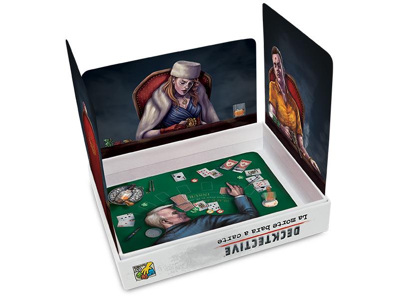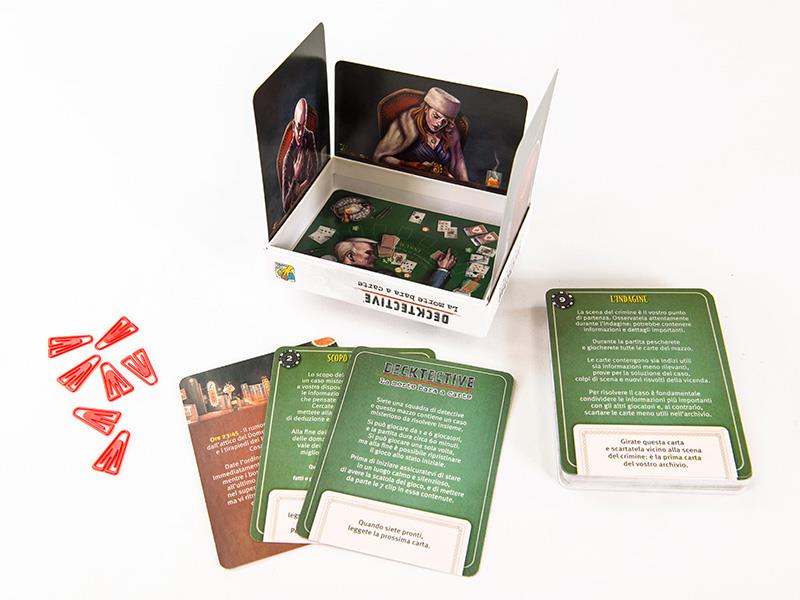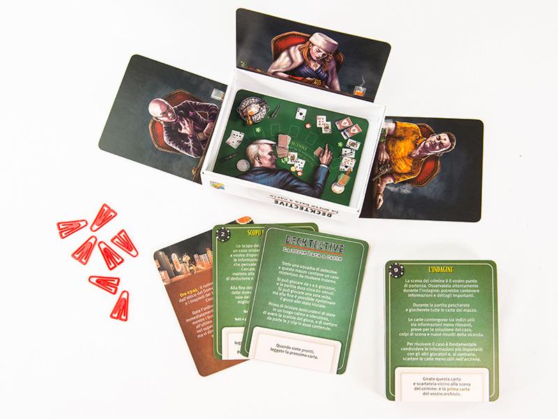 Decktective - La morte bara a carte. Las Vegas, 1955. Il casinò Domein ospita una partita clandestina fra tre boss della malavita e il sindaco. Fate irruzione ma siete sorpresi: al tavolo da gioco sono tutti morti! Qual era la posta in gioco? Chi li ha uccisi? Raccogliete gli indizi: documenti, tracce, registrazioni audio... In un Deck di carte, un caso misterioso per veri detective. Contenuto: 60 carte extra large, 7 clip colorate. Giocatori: 1-6. Durata: 60 min.